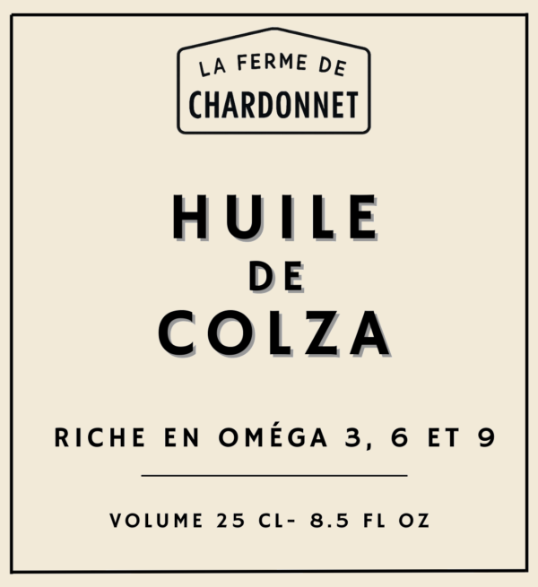 L’huile de colza de La Ferme de Chardonnet est une huile végétale obtenue à partir des graines de colza, qui appartient à la famille des brassicacées. Riche en acides gras monoinsaturés (oméga 9), polyinsaturés (oméga 6 et oméga 3) et en vitamine E, elle a de nombreux bienfaits pour la santé. Elle agit notamment pour le renforcement du système cardiovasculaire, le système nerveux et la prévention du vieillissement cellulaire. Elle se consomme à froid ou à chaud. Cependant, elle ne supporte pas les températures trop élevées. Son goût est neutre après raffinage, ou fruité et légèrement amère si elle est vierge. On l’utilise fréquemment pour assaisonner les salades, les crudités, les légumes, ou pour cuire les viandes, les poissons, les œufs, etc…